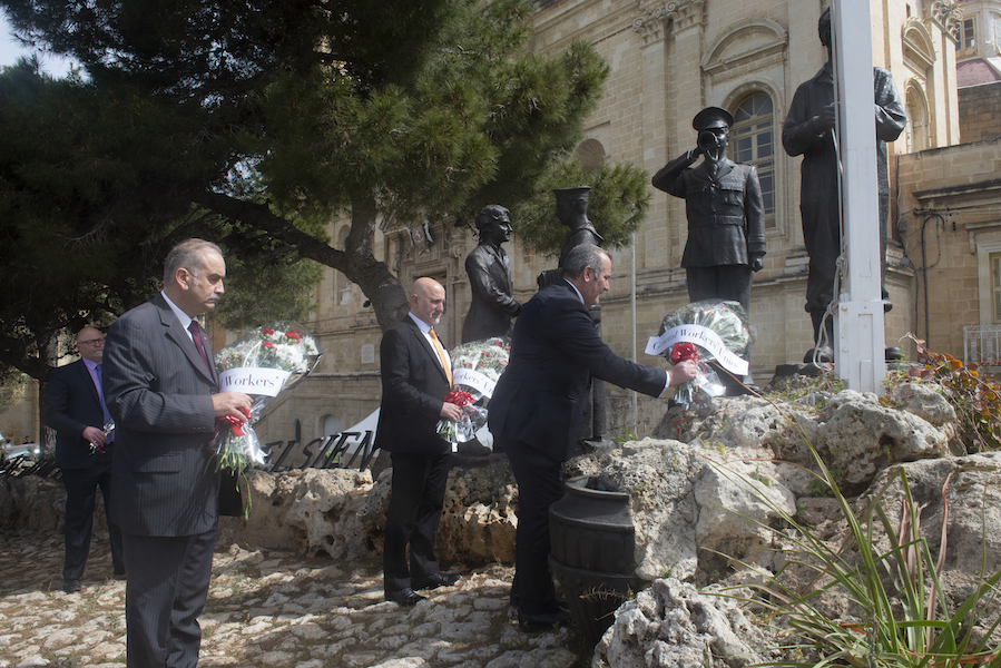 The laying of flowers at the foot of the monument on Freedom Hill in Vittoriosa was carried out by General Secretary Josef Bugeja in the presence of trade union officials including President Victor Carachi and Deputy General Secretary Kevin Camilleri.